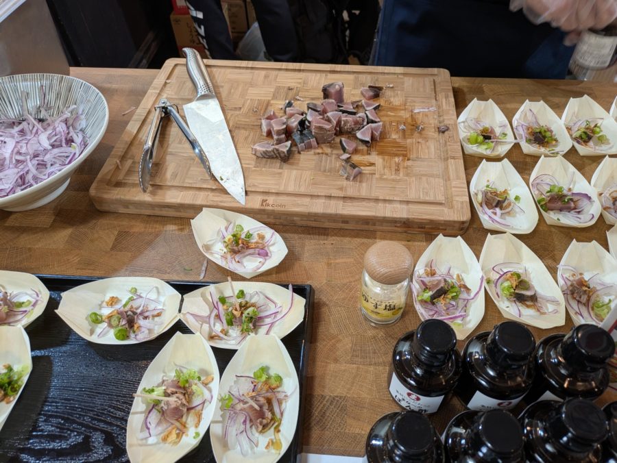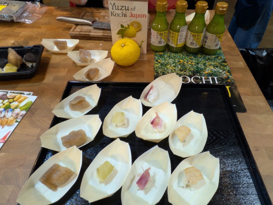 フェアには、ユズを使ったドリンクや野菜でできた「田舎寿司」、カツオのたたきなど、高知県から数々の名産品が持ち込まれました。用意していたサンプルをたくさんの方に試食いただけただけでなく、食べてすぐに「この商品はどこにあるの?」と聞かれることも多かったです。この地域の購買力の高さが垣間見えました。最終日には在庫が底をつく商品まで出るほど、大盛況となりました。