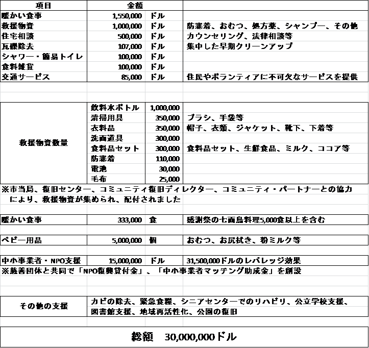 我々はこれまでの復興に対し誇りを感じている。しかしまだまだやるべきことが残っていることも認識している。学校、公園、住むところを失った家族等を支援するため、今後も息の長い復旧・復興活動に全力で取り組んでいく。そして、引き続き市当局やコミュニティと緊密に連携した取組みを行なっていく」