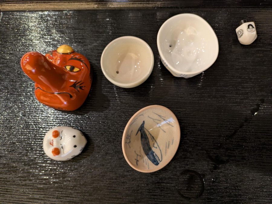 酒杯なのですが、何かおかしなことに気が付きましたでしょうか?そうです、杯なのに、とがっていたり、穴が開いていたりするのです。つまり、一気に飲み干さないといけないのです。左下の女性の顔の杯(「おかめ」)は、形は問題ないのですが、「女性の顔を下に向けてはかわいそう」なため、同じく一気に飲み干す必要があります。高知県では、こういった宴会を楽しむ遊びが発達しています。