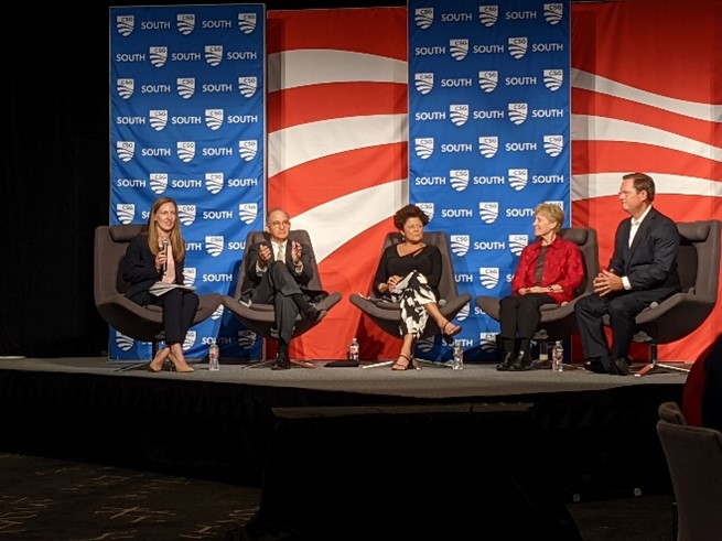 年次総会には米国南部地区の州議会議員など約1,400人が参加し、各分野で活躍する南部地区出身のゲストがスピーチを行いました。また、コロナ禍で深刻化したメンタルヘルス問題、EV車の普及に伴う燃料税による歳入減と道路の維持管理の問題、教員不足問題などに関するセッションが行われました。